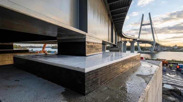 虽然聚四氟乙烯提供了滑动功能,但下方的层压弹性体(橡胶)支座垫片支撑着结构巨大的垂直重量。正是这种复合设计使其能够同时处理载荷和运动。